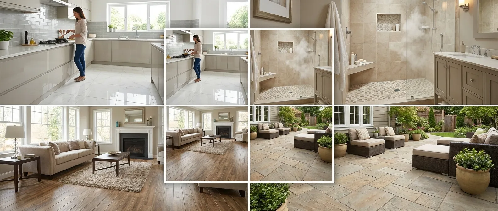 When choosing tile, it’s essential to consider factors like durability, water resistance, and ease of cleaning. Kitchens and bathrooms, for instance, require tiles that can withstand moisture and heavy use, while living areas might benefit from tiles that offer both comfort and visual appeal. Outdoor spaces and specialty rooms like mudrooms and laundry rooms also have their own unique requirements.
